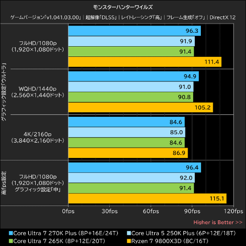 モンスターハンターワイルズでは、グラフィックプリセットを「ウルトラ」に設定して、フルHD/1080p、WQHD/1440p、4K/2160pで平均フレームレートを計測。また、フルHD/1080pでグラフィックプリセットを「中」に落とした高fps設定でも計測を行なった。