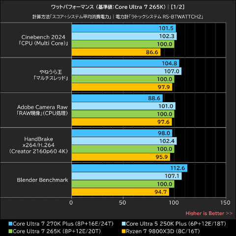 ベンチマークスコアをシステムの平均消費電力で割ることによって求めたワットパフォーマンスを比較したものが以下のグラフ。今回のグラフでは、Core Ultra 7 265Kを基準に指数化して比較している。