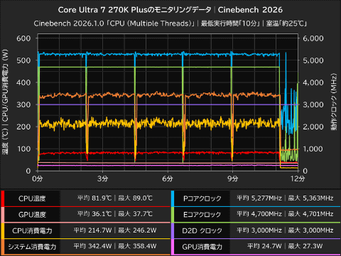 テスト実行中のCore Ultra 7 270K Plusは、Pコア平均5,277MHz、Eコア平均4,700MHzで動作しており、この時のCPU温度は平均81.9℃(最大89℃)、CPU消費電力は平均214.7W(最大246.2W)だった。