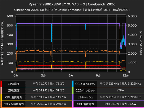 HWiNFO64 Proを使って計測したCinebench 2026「CPU(Multiple Threads)」実行中のモニタリングデータをまとめたものが以下のグラフ。テスト時の室温は約25℃。