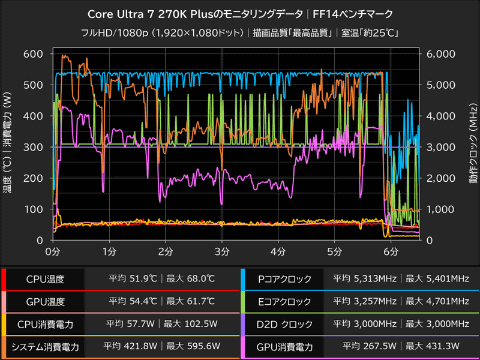 テスト実行中のCore Ultra 7 270K Plusは、Pコア平均5,313MHz、Eコア平均3,257MHzで動作しており、この時のCPU温度は平均51.9℃(最大68℃)、CPU消費電力は平均57.7W(最大102.5W)だった。