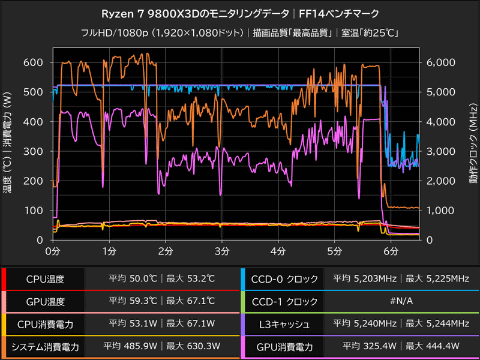 HWiNFO64 Proを使って計測した「ファイナルファンタジーXIV: 黄金のレガシー ベンチマーク(フルHD/1080p、最高品質)」実行中のモニタリングデータをまとめたものが以下のグラフ。テスト時の室温は約25℃。