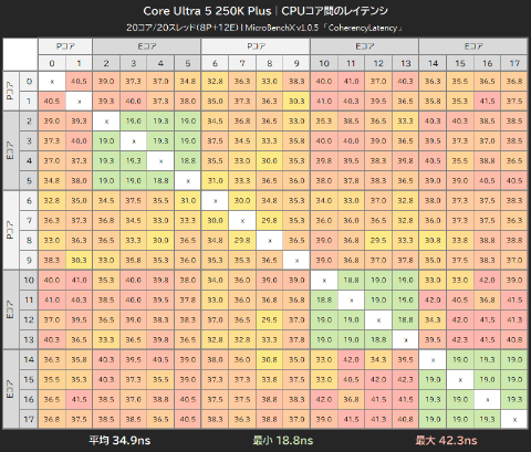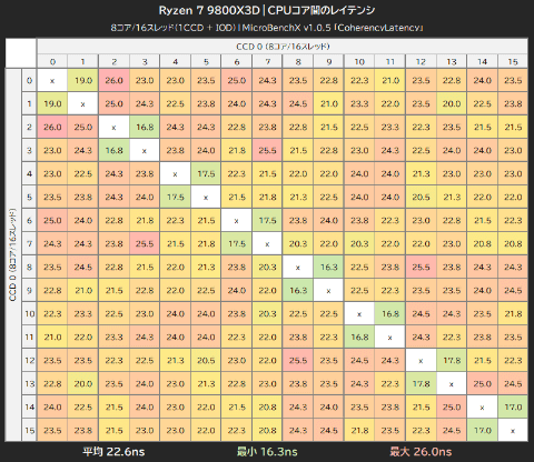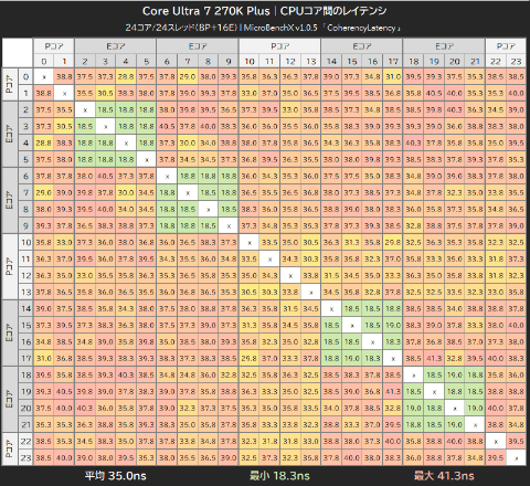 MicroBenchXの「CoherencyLatency」でCPUコア間のレイテンシを計測した結果が以下のマトリックス表だ。