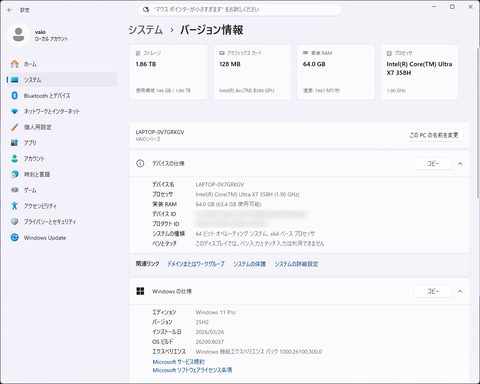 今回お借りした試用機は、一段スペックの高いCore Ultra X7 358H(16コア16スレッド、最大4.8GHz、Processor Base Power 25W)搭載の「勝色(かちいろ)特別仕様」に準じたモデル(ディスプレイ解像度のみ本来の仕様と異なる)。さらなるハイパフォーマンスが期待できるだろう。