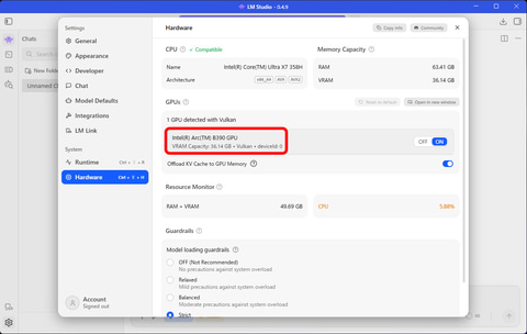 試用機(メモリ64GB)では、GPU側から使えるVRAM容量表示は36.14GB。ローカルAIを扱えるツール「LM Studio」を立ち上げてみると、30GBを超えるAIモデルであってもVRAMにフルでオフロード可能と判定される。