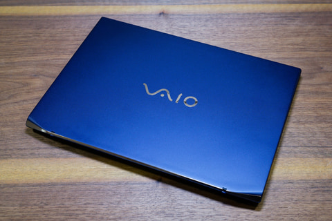VAIOのコーポレートカラーである「勝色」を施した勝色特別仕様の高級感は相変わらず。表面のしっとりとしたマットな質感と、天板にあるゴールドのVAIOロゴやオーナメントとの組み合わせは所有感を高めてくれる。