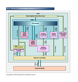 これをNVIDIAのFermi系のGF114アーキテクチャと比較すると次のようになる。NVIDIAのこの世代ではSM(Streaming Multiprocessor)の中に16レーンのSIMDユニットが3個、その他にスーパーファンクションユニットが8レーン備えられている。NVIDIAのSMは、AMD新アーキテクチャのCUにほぼ相当する。1ユニットの規模としては、AMDのCUの方が規模が大きい。
