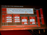 AMDのGraphics Core Nextでは、これをさらに推し進め、より多くのプリミティブパイプと、より多くのラスタライザを搭載できるようにする。下の図のようになる。この図ではレンダーバックエンド(ROP)がラスタライザのスキャンコンバータとくっついているが、ここは疑問が生じる。レンダーバックエンドは、膨大なメモリアクセスが必要となるため、通常はメモリコントローラ側に接続されているためだ。また、もともとレンダーバックエンドは多重化されている。いずれにせよ、プリミティブパイプとピクセルパイプ(スキャンコンバージョン)が多重化されることは確実だ。NVIDIAがすでに同様の方法を採っている。