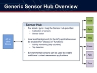 センサーからのデータは、一括してセンサーハブチップに入力され、センサーデータのプロセッシングの多くはセンサーハブ内部で行なわれる。実際にはセンサー側にプロセッシング機能を持たせた製品も登場しており、その場合はHubとの間で機能の棲み分けが行なわれる。いずれにせよ、メインのモバイルSoCのアプリケーションプロセッサをスリープから起こすことなく、センサーハブまでの層でセンサーデータの基本的な処理を行なうことになる。