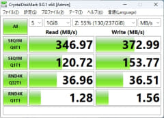 そして、デスクトップPCの内蔵SSDへのアクセス速度は、シーケンシャルリードが304.97MB/s、シーケンシャルライトが372.99MB/sだった。こちらも先ほどと条件は同じなので、十分な速度と言える。
