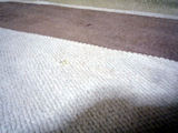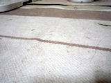 | 【写真03】茶色っぽいのはほとんどが猫の抜け毛。長いのは人間の髪の毛 | 【写真04】写真03とほぼ同じ場所を、COCOROBOで掃除後に。さすがにシミまではどうにもならないものの、毛に関しては恐ろしくよく取れる。 |