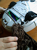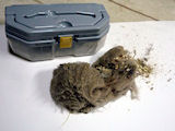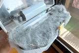 | 【写真07】この状態で、そろそろダストボックス満杯の警告が出始める | 【写真08】ダストボックスの中身。猫の毛がたっぷり収穫できている | 【写真09】ここに居る猫は雉虎+白柄ということもあり、ややグレーめいた色に |