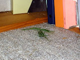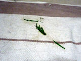 | 【写真10】さすがにこういう隅までは掃除しきれないようだ | 【写真11】こういう草の吐き戻しも結構苦手。角すぎてうまく回転ブラシでキャッチできない事と、吐いた直後のぬれた状態では回転ブラシで巻き取りが難しいらしい | 【写真12】こちらは部屋の比較的中央の吐き戻し。簡単かと思いきや、意外にキャッチできない。10回ほど行き戻りつつ、やっと除去できた |