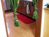 ただ、ソファー下にはラグが敷いてある(写真14)し、居間と繋がる台所にもマットが敷いてある(写真15)。スタジオ兼用ということであまり家具の類はないのだが、食卓やその椅子、ピアノの足、柱、ソファーなどにCOCOROBOががんがんぶつかる(そのぶつかる音が結構響く)、お部屋がスタジオ構造なので騒音が響く、ラグが見事に絡みつく(写真16)といった状況から、結局COCOROBOを掛ける際にはこんな具合(写真17)に色々なものを上げてから、という対策が必要だったそうである。