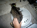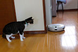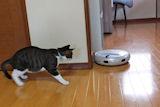 全体としては、概して猫の反応は悪くなかったと思う。以前の掃除機の場合、スイッチを入れた瞬間に、全員隣の部屋やエレクターの一番上の段とかに避難してしまい、ある程度の距離をもって見守るということはなかった。騒音の絶対値そのものがやや下がっているのと、動きは唐突といえば唐突だが、速度そのものは割りと遅めで、いきなり進路変更をするのではなく、移動→停止→回転→停止→移動というシーケンスを踏むので猫としても「いつでも逃げられる」と判断しているのかもしれない。とはいえ、1カ月位で「ルンバ猫」ならぬ「COCOROBO猫」を撮影するのは無理であった。