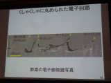 染谷氏はセンサーの専門家。米国ベル研究所で、プラスチックを使って「イモ判のように簡単に」回路を創れることを学んで帰国した後、2003年、ロボットスキンを開発した。これは今は限られた感覚しか持たないロボットをはじめとしたエレクトロニクスに、五感や感性、皮膚感覚を再現することを目指そうとしたものだ。その後研究は発展し、2006年にはリアルタイムで圧力分布を測ることもできるようになった。当時作られた試作品は未だに研究室で動いているという。染谷氏は「有機半導体は信頼性の問題で苦心している。だが、半導体にはP型とN型がある。P型の半導体は非常に安定して動くことを我々は実験から実証した」と語った。