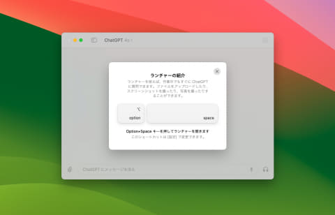 Mac版ChatGPTでは、キーボードショートカットで「ランチャ」というChatGPT用の小窓を呼び出せます。これにより、どのアプリを使っているときでも即座にChatGPTを利用することが可能です。
