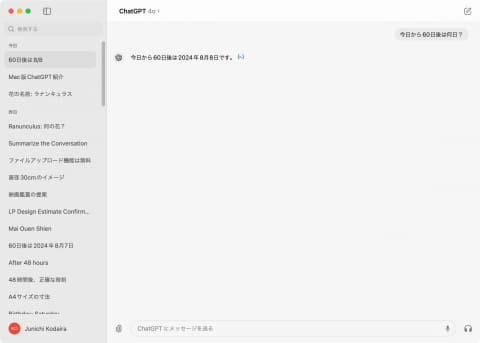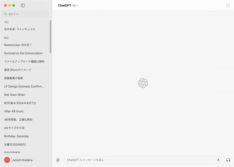 Mac版ChatGPTの基本的な機能や使い方は、Webブラウザ版のChatGPTと同様です。過去の利用履歴を参照したり、Webブラウザ版で作成した「My GPTs」を利用したりすることもできます。