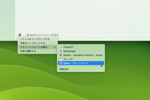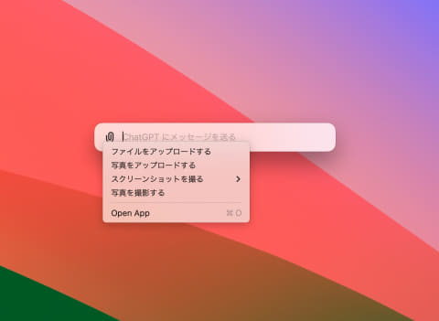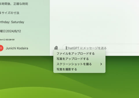 また、Mac版ChatGPTでは、ほかのアプリのスクリーンショットを素早く撮影したり、Macの内蔵カメラを起動して写真を撮ったりすることも可能です。