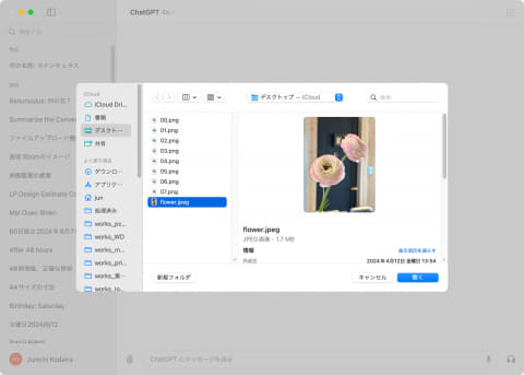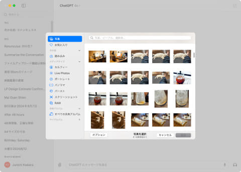画像やファイルのアップロードはWebブラウザ上のChatGPTもサポートしていますが、「写真」アプリ内にある写真を素早く選択できるなど、Mac版ChatGPTを使うほうがより素早く行なえます。