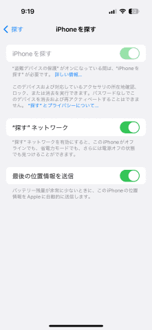 また、デバイスがオフラインのときでも探せるように[“探す” ネットワーク]をオンにし、iPhoneやiPadではバッテリ残量が少なくなったときにデバイスの位置情報をAppleに送信する[最後の位置情報を送信]もオンにしておきましょう。