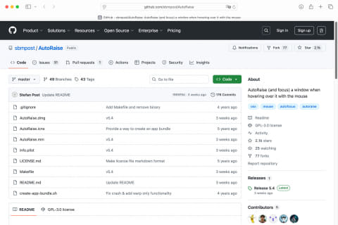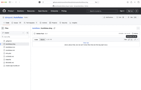 AutoRaiseはApp Storeではなく、GitHubという開発者向けプラットフォームで公開されているため、そこからダウンロードします。