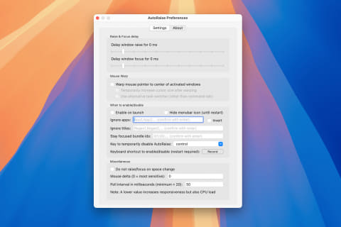 AutoRaiseは初期状態でも十分便利に使えますが、設定パネルを開いて自分の作業スタイルに合わせて調整すると、さらに快適に利用できます。