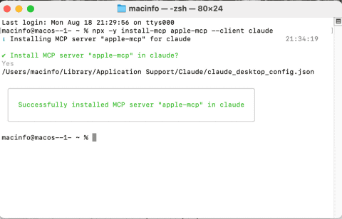 ターミナルを起動してClaude用のコマンドを入力して実行すれば、Apple MCPのインストールと設定が自動的に行なわれます。