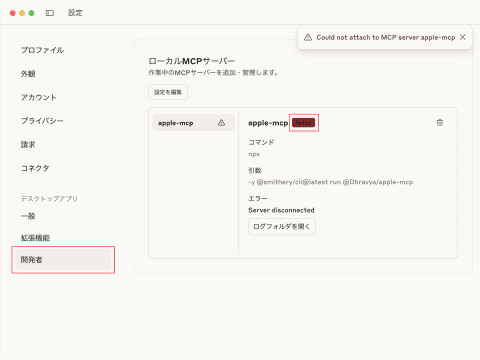 また、Apple MCPをインストールした直後は、Claude Desktopを起動した際に複数のエラーメッセージが表示されることがあります。その場合は、いったんアプリを終了して再度起動してください。