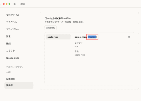 そのうえで[Claude]メニューから[設定]を開き、サイドバーの[開発者]をクリックして[ローカルMCPサーバー]の動作を確認します。青色のボタンに[running]と表示されていれば、正常に動作しています。