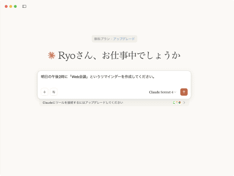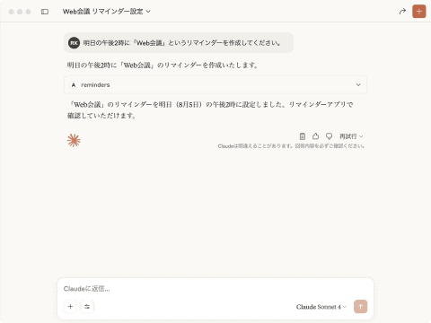 これらの機能に関連する内容を自然な言葉で入力して送信すると、Claudeがその意味を解析し、対応するアプリの操作を自動で実行してくれます。