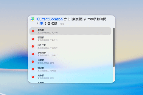 2つの地点を指定して、移動にかかる時間を調べられるアクションです。移動手段は「車」「徒歩」「自転車」「交通機関」から選べます。「マップ」アプリを開かずに確認できるのが魅力です。