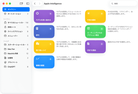 Apple Intelligence関連の一部のワークフローはあらかじめ「ギャラリー」に複数登録されているので、まずはダウンロードして動作を試し、利用目的に合わせてカスタマイズするとよいでしょう。