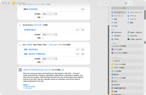 たとえば[午前の要約]というワークフローを開くと、「現在地の天気を取得」や「カレンダーを検索して未完了のリマインダーを抽出」、Apple Intelligenceのアクションが組み合わさって出来上がっていることが分かります。