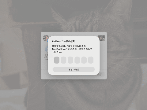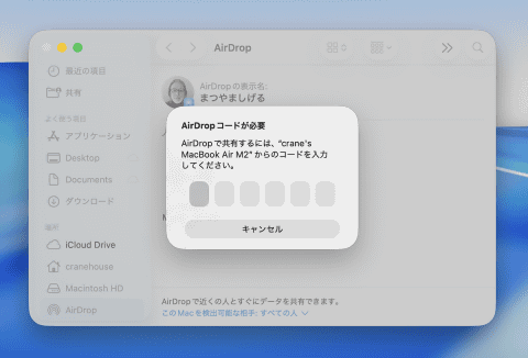 具体的には、ファイル送信時に受信側のデバイスへAirDropコード(6桁の数字コード)が表示され、そのコードを送信者が入力しなければ転送は完了しません。