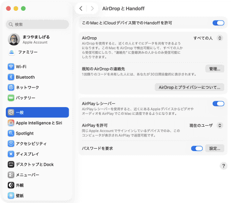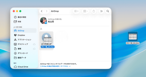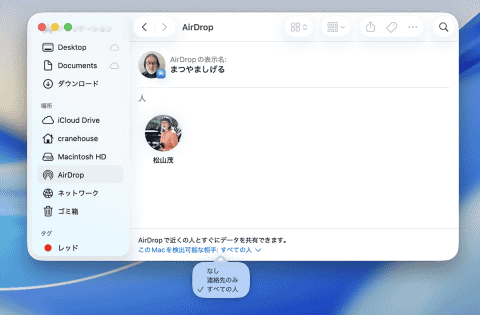 というのも、この設定では、あなたのMacのデバイス名が周囲の見知らぬ人のAirDrop画面に表示され続けるため、名称によっては個人情報が漏れる可能性があるからです。