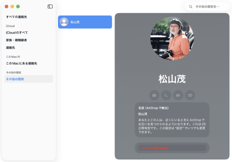 相手の情報は自動的に「連絡先」アプリの「その他の既知」リストに保存され、30日が経過すると再びAirDropコードでの認証が必要になります。