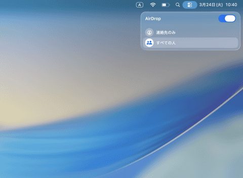 | なし | 誰からもAirDropの受信リクエストを受けつけない ※自分のMacが他の人のAirDrop画面に表示されなくなる | ・公共の場での作業時 ・AirDropを使う予定がないとき |