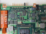 基板の底面に目を移すと、バッテリ端子付近にMaxim製のバッテリ充電のためのコントローラ「8724E」が見える。また、CFスロットの下に絶縁シートで覆われている富士通製のコントローラが2つ見えるが、「MB90F378」は16bitのマイクロコントローラで用途は不明。一方その隣の「S1L50552F33N200」はデータシートが見つからないのだが、セイコーエプソンが設計したゲートアレイ「S1L50000」シリーズではないかと推測される。
