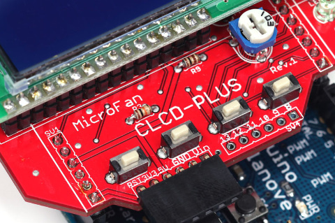 | 今回の主役その2。文字表示用のArduinoシールド「CLCD-PLUS」は、マイクロファンネットショップで入手可能です。16字×2行のLCDのほかに、4つのタクトスイッチやLED、コントラスト調整用の半固定ボリュームも見えます |