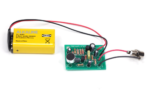 | DTMF音を拾うマイクには「2石マイクアンプキット」を使用しました。コンデンサーマイクもセットになっていて、6~12Vの電源さえ用意すればマイク入力をラインレベルに増幅できます。コンデンサーマイクの極性がわかりにくいときは、テスターでマイク外周-ピン間の導通をチェック。0Ωを示す端子がGNDです |
