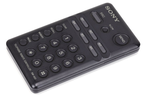 | DTMF音を発生させるトーンダイヤラ「SONY RM-A60」を用意しました。表面にテンキー、裏面にスピーカーが付いていて、テンキーをプッシュするとスピーカーからDTMF音が出ます。あらかじめ十数桁のボタンを押したあと「SEND」キーを押し、一気に送出することもできます |