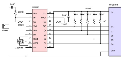| マイクアンプやスマートフォンなどをつなぎやすいよう、RCAジャックを用意しました。電源はArduinoから供給されます。CM8870は5Vで動作するので、Arduinoも標準的な5V仕様のもの(たとえばArduino Uno)が適しています。コンデンサは積層セラミック型を使用しました。5個のLEDは省略可能ですが、あると動作検証がしやすくなります |