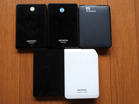 HDD類は基本的にポータブルサイズを選ぶ。それなら引き出しにも入るからだ。ここのところ、HDDの価格あたり容量が全く大きくならないのが大いに不満である。単純だが、今のところこれがベターだと思っている。