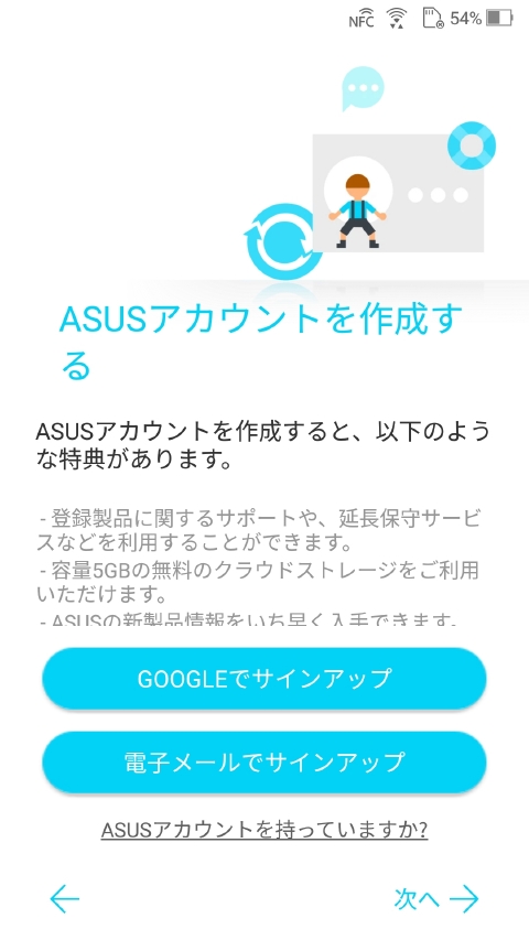 初期セットアップはSIMを入れずWi-Fiのみで行なった。画面的には計14。途中、ASUSアカウント、Google Driveプロモーションなどが入るので若干画面数が多い。