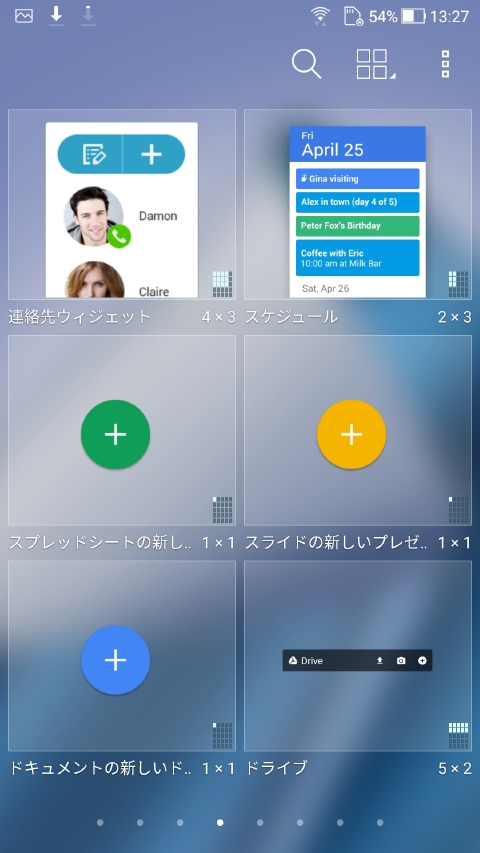 ウィジェットは、「アナログ時計」、「カメラ」×2、「すべてのアプリ」、「デジタルクロック」、「ファイルマネージャー」、「検索」、「時計」×4、「直接メッセージを送る」、「直接発信」、「天候」×2、「電卓」、「連絡先」×2、「連絡先ウィジェット」、「スケジュール」、「スプレッドシート」、「スライド」、「ドキュメント」、「ドライブ」、「ドライブのショートカット」、「ドライブのスキャン」、「フィード」、「ホーム画面のヒント」、「メッセージリストウィジェット」、「メッセージ会話ウィジェット」、「運転モード」、「経路を検索」、「月」、「交通状況」、「設定のショートカット」、「Chromeのブックマーク」、「Gmail×2」、「Gmailのラベル×2」、「Google App」、「Google Keep×2」、「Google Play Music×2」、「Google Sound Search」、「Musicプレイリスト」、「Playマイライブラリ」。