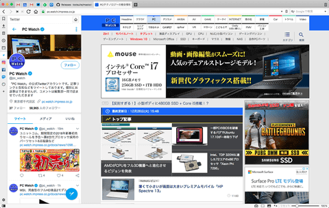 理由は、画面キャプチャをご覧いただければわかると思うが、画面の端にもう1つ長細い独立したViewを置けるのだ。ここへ、Twitter、Instagram、Facebook、Mastodon、volumioを割り当てている。もちろんこれらにこだわる必要もなく、スマートフォンに対応しているサイト(レスポンシブ)であればなんでも表示できる。大きいViewはメインなので、閲覧したいサイトを表示しつつ、平行して、先のサイトがそのまま画面上で見られて非常に便利だ。