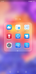 Googleフォルダに、「Google」、「Gmail」、「マップ」、「YouTube」、「ドライブ」、「Play Music」、「Playムービー&TV」、「Duo」、「フォト」、「ドキュメント」、「スプレッドシート」、「スライド」。ツールフォルダに、「天気」、「電卓」、「音声レコーダー」、「懐中電灯」、「ミラー」、「HiCare」、「コンパス」、「バックアップ」、「Phone Clone」、「ダウンロード」、「Translator」、「Quik」。お勧めフォルダに、「Amazon Assistant」、「Booking.com」、「Instagram」、「Messenger」。ドックに、「電話」、「連絡先」、「メッセージ」、「Chrome」、「カメラ」。