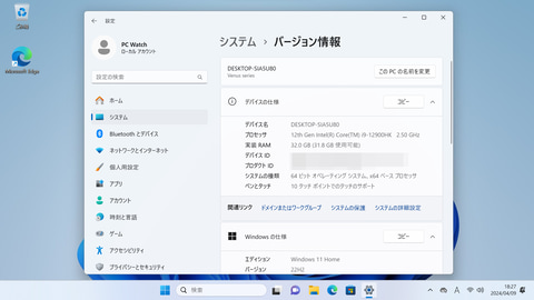 メモリはDDR4-3200 16GB×2の合計32GB。SO-DIMMスロット×2で最大64GBまで搭載可能だ。ストレージはM.2 2280 SSDの1TB。どちらも16GBと512GBを選択できる。OSはWindows 11 Home。バージョンは22H2だったので古いが、この範囲でWindows Updateを適応し評価した。