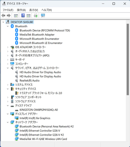 ストレージは、M.2 2280 SSD 1TBの「KINGSTON OM8PGO41024Q-A0」。メーカーのデータは見つからなかったが、ここによると、Seq. Read 4,677 MBytes/Sec、Seq. Write 3,717 MBytes/Sec。CrystalDiskMarkのスコアもそのまま(以上に)出ている。C:ドライブのみの1パーティションで約952GB割り当てられ空き915GB。